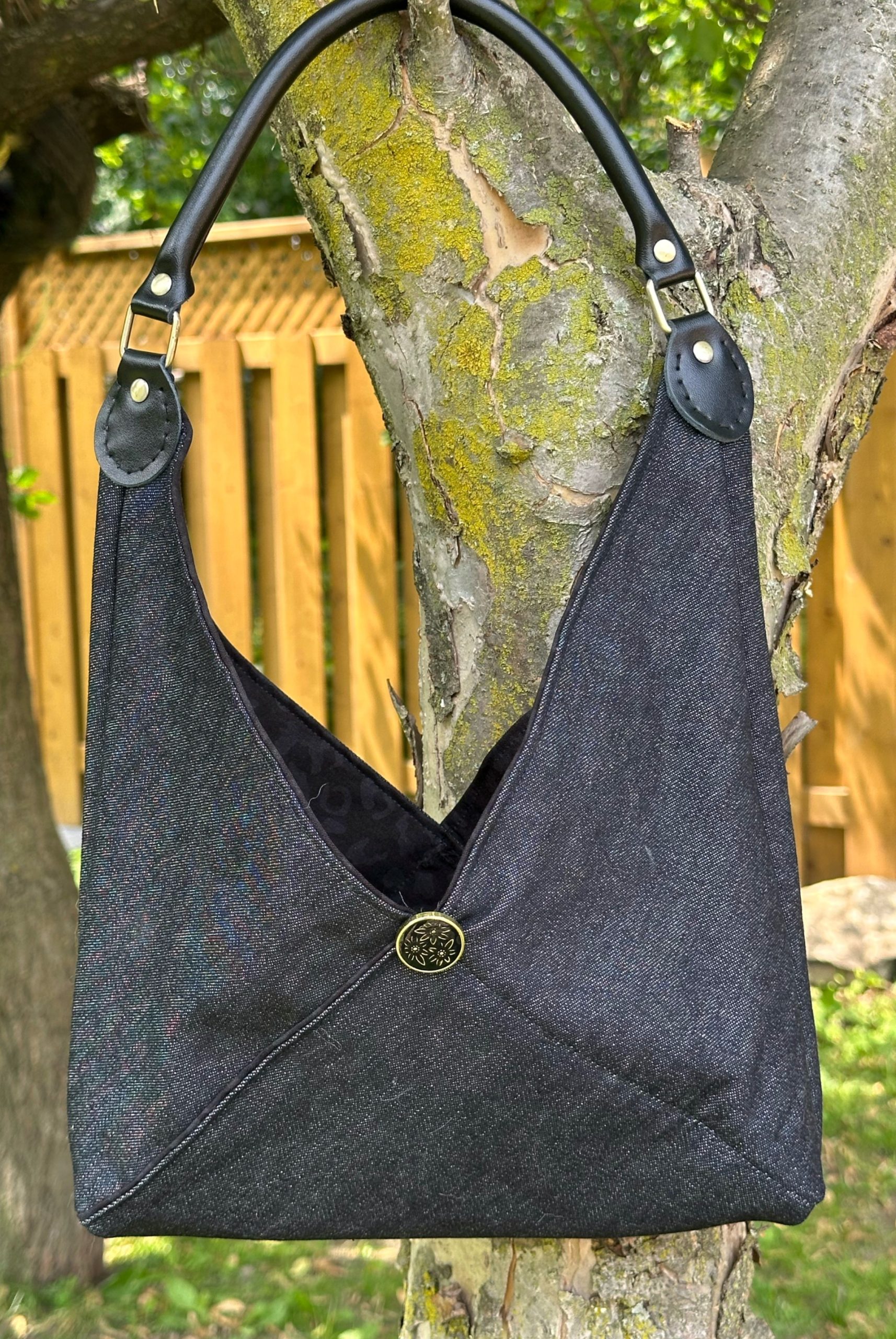 Used dark denim for the outer fabric, black cotton fabric for the lining, and the handle is upcycled.