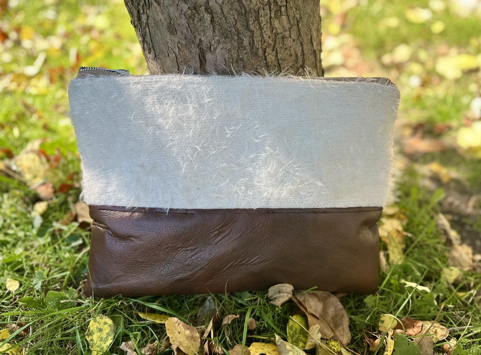 Two tone zippered clutch – I used an old white sweater for the top, faux leather for the bottom, and a satin floral fabric for the lining.
